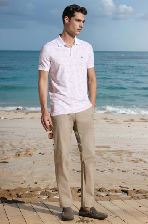 This season, solid polo shirts in soft pastel shades are particularly popular. Pair them with well-fitted jeans or chinos for a refined look. Striped polo shirts, when combined with cargo pants, can lend a carefree, vacation-ready vibe. For footwear, sneakers are a great choice to complete this polished yet relaxed outfit.